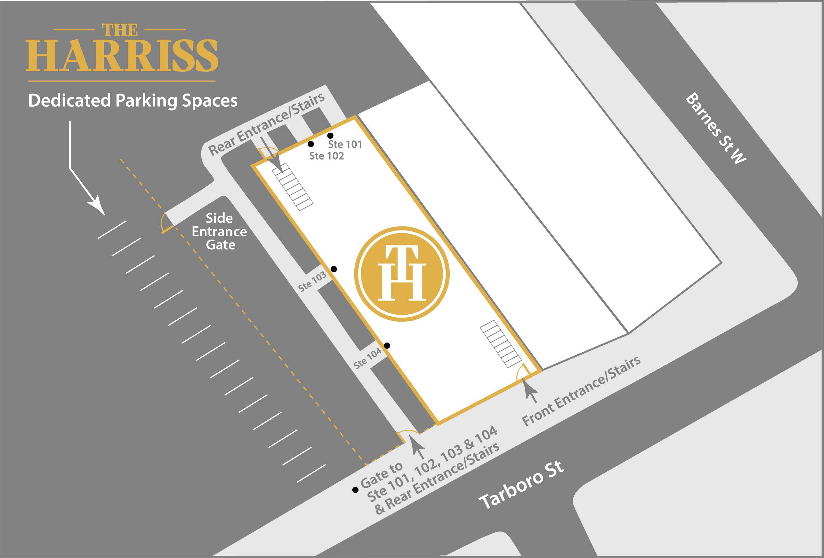 MapWe offer complimentary designated parking in the large lot immediately to the left of the hotel. Park in any open Harriss space.
